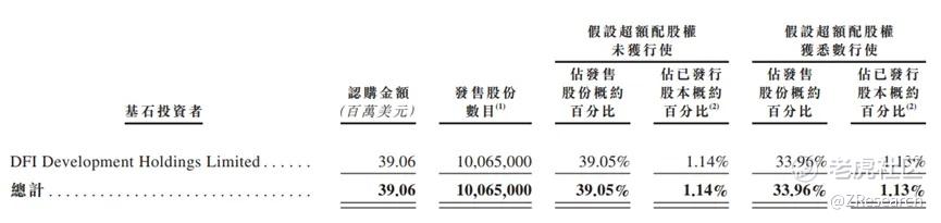 共有一名基石投资者DFl Development Holdings Limited,认购39.06亿美元,若按发行价格计算,相当于此次全球发售股份的39.05%及全球发售完成后已发行总股份的1.14%。
