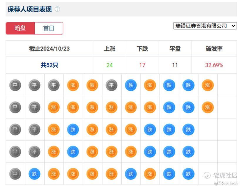 瑞银证券历史上作为保荐人参与了52个项目,其中暗盘有24家公司上涨17家公司下跌,破发率32.69%。