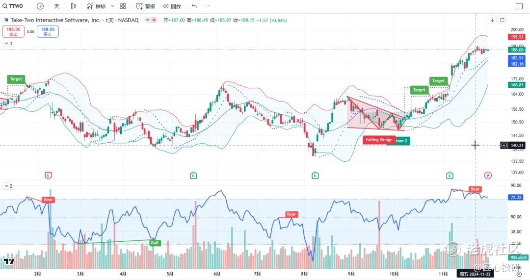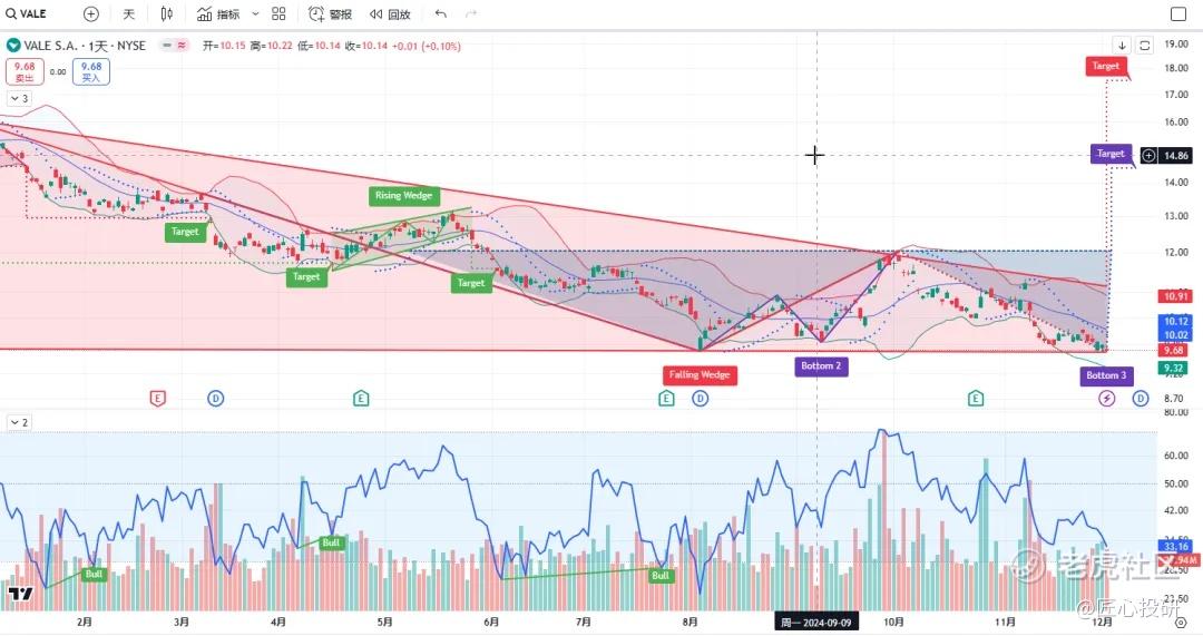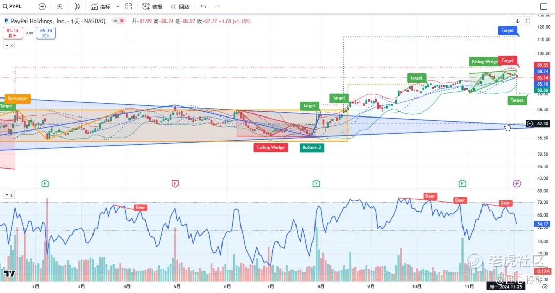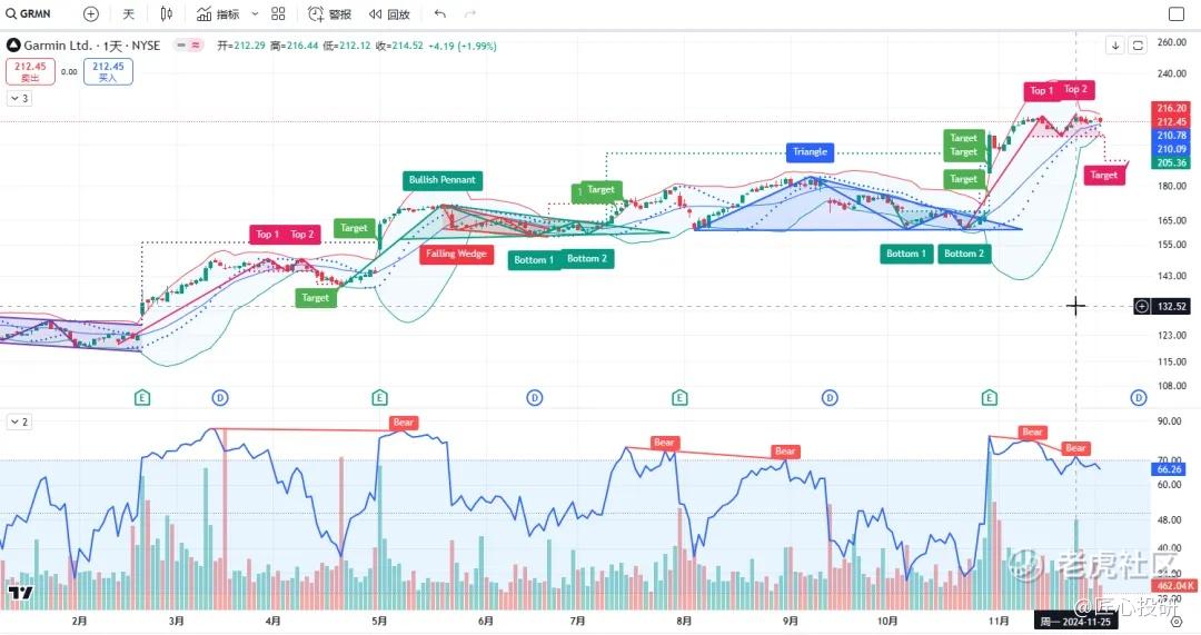 关于目标价:图中标注的“Target”是对应形态的理论目标价位。请注意,目标价并不保证100%达成,有时也可能失效。(内容比较多,图中没有Target的代表无形态,如果没有特殊说明,那就是无形态无目标价)