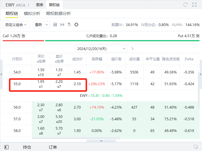 看多EWY的投资者可以卖出到期日为12月20日,行权价为55的看跌期权,获得权利金210美元。