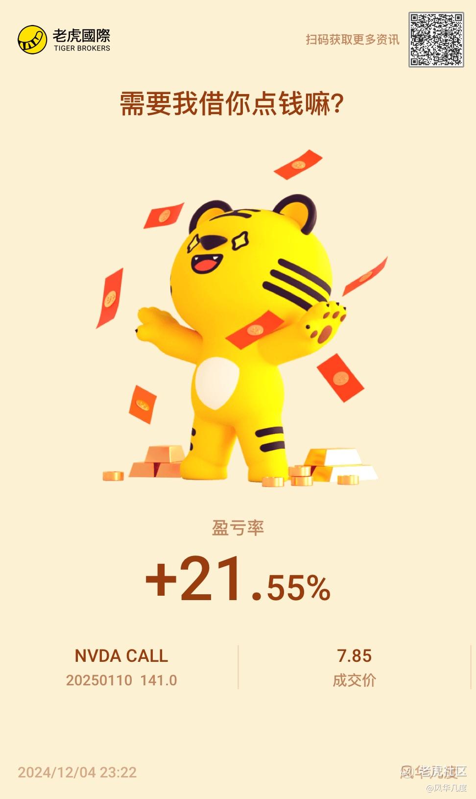 $NVDA 20250110 141.0 CALL$ 上涨的趋势依然存在,不过最近美联储会议对于降息的态度不明朗,1个月时间到期的call,时间价值加速磨损,不做对冲或者期权组合的话,还是谨慎为妙,投资还是要稳健,过于激进很容易归零,尤其是做衍生品交易!
