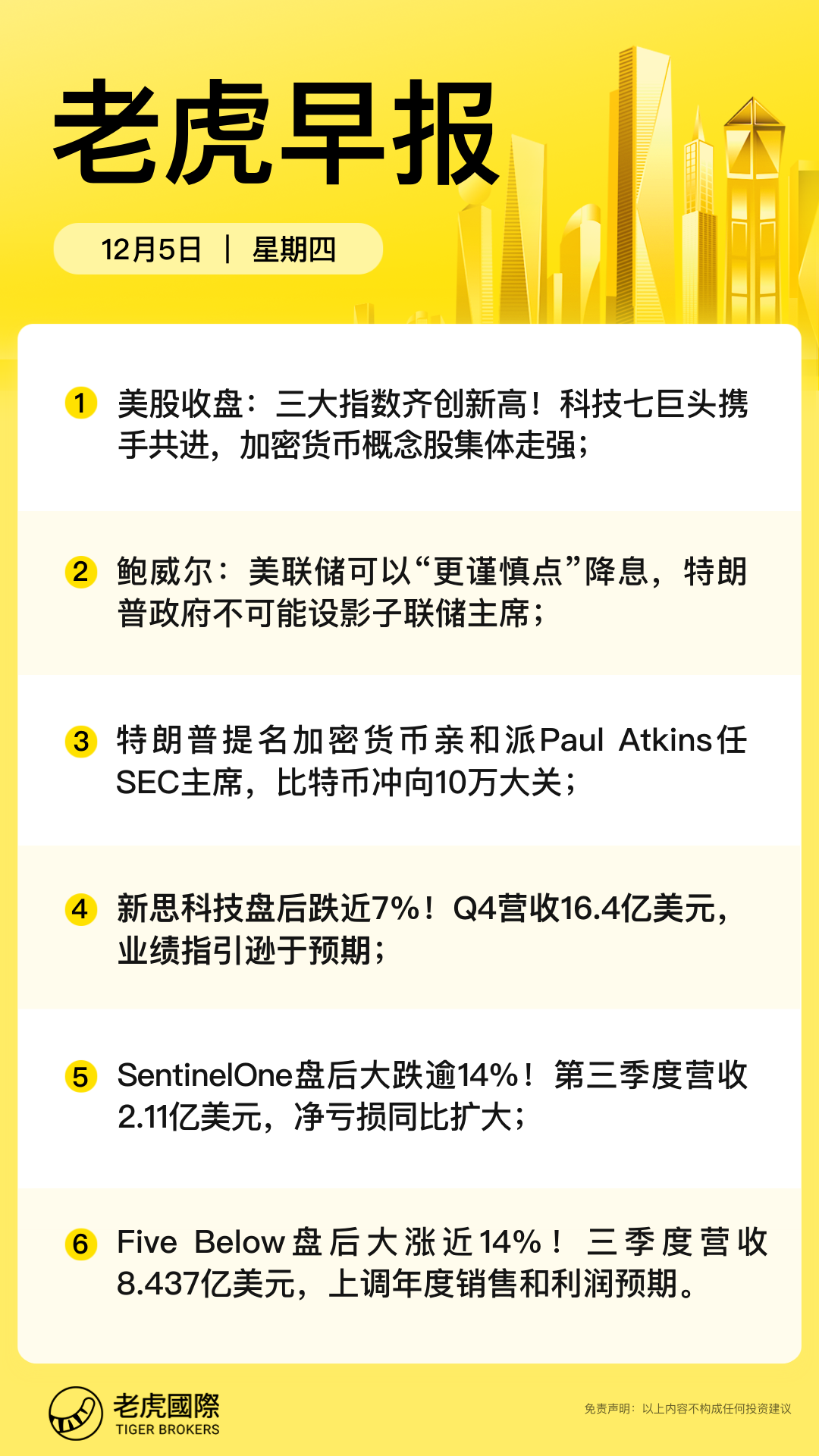🔥【12月5日】美股三大指数齐创新高,加密货币概念股集体走强,今天买点啥?