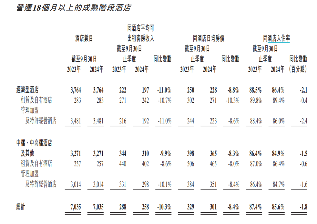 而中档/中高端酒店,平均客房价为310元,较去年同期的344元下滑了10%;中高端酒店的入住率也从86.4%下滑至84.9%。也就是说,华住今年前三季度面临着量价齐跌的双影响。