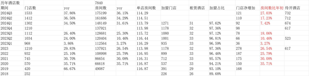 根据曼巴投资统计,门店数1533家,房间数已有175199间,同比增长36.15%,比年初的房间数多了27%,比过去2年的增速都要快,目前待开酒店732家,算下来未来2年内门店数就会逼近2500家的水平,所以目前还是一个高速增长期。