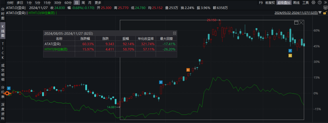 虽然今年整个消费大环境都面临着竞争加剧,客单价下滑的局面,但也有个别运营能力强的公司脱颖而出,例如之前提到的泡泡玛特、百胜中国、达势股份;在酒旅行业里,亚朵在今年的股价表现也相当亮眼,年内已涨超50%。