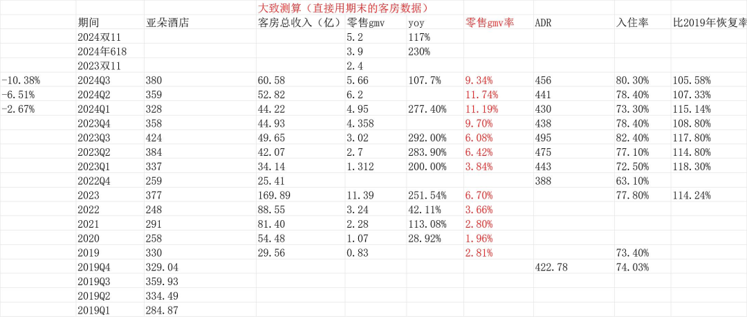 的确从三季度开始,无论是餐饮大盘或是零售大盘都受到了更大的压力,而酒店的入住率和平均单间收入都在双双下滑,即使看十一佳节的旅游收入表现,我们之前也提到过,实际表现也是差于去年的。