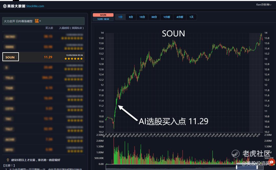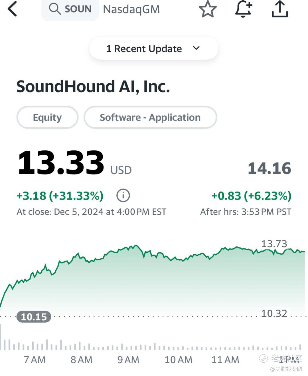 今天,一开盘就在11.29美元提示VIP们关注 SOUN,随后股价开始一路狂奔,收盘价格13.33美元,涨幅超30%!盘后再涨超6%。