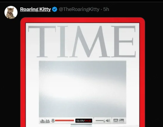 Roaring Kitty发布了一张改编自《时代》杂志封面的图片,该图片展示了一台空白的电脑屏幕,屏幕上带有类似YouTube的媒体播放器。这张图片似乎是2006年12月25日《时代》杂志封面的修改版,当时“你(YOU)”(即美国公众)被评为“年度人物”。