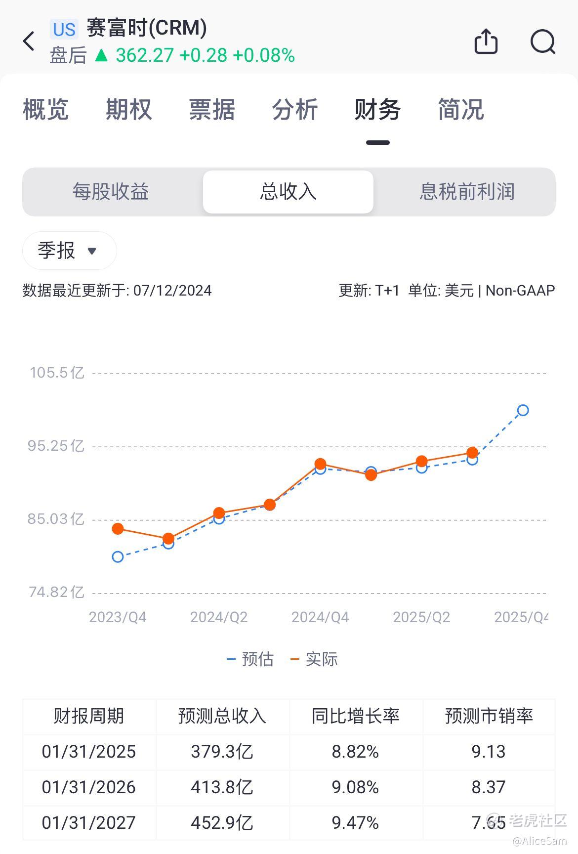 他们这个季度的营收表现还是不错的,2025财年第三季度营收达94.1亿美元,同比增长8%,超过预期的93.4亿美元。看下面这个老虎个股财务曲线图,连续3个季度都是一个增长的趋势,还不错哦 👍
