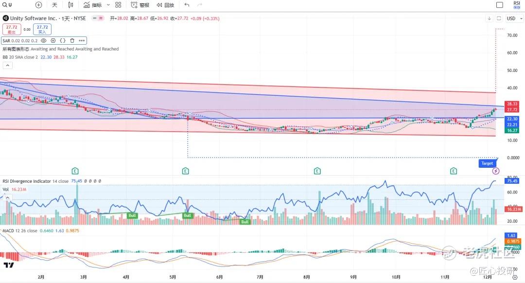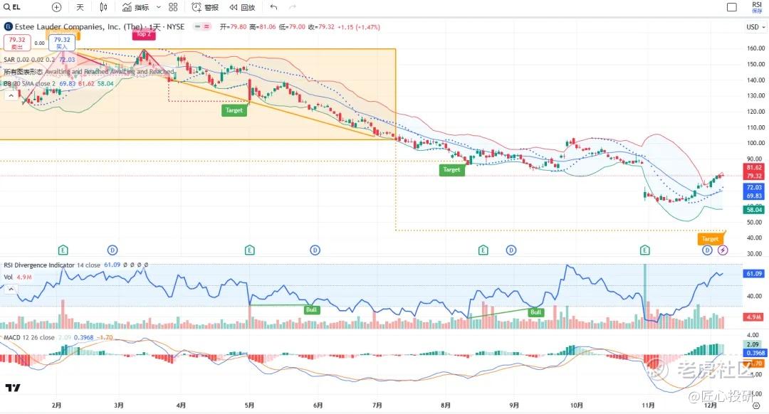 关于目标价:图中标注的“Target”是对应形态的理论目标价位。请注意,目标价并不保证100%达成,有时也可能失效。(内容比较多,图中没有Target的代表无形态,如果没有特殊说明,那就是无形态无目标价)