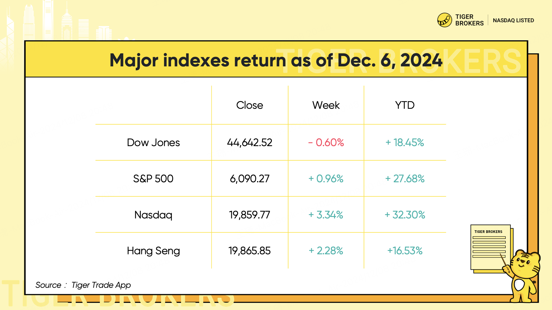 标普 500 指数和纳斯达克指数连续第三周上涨,并于周五齐刷历史新高。他们上周分别上涨 0.96% 和 3.34%。11月美国非农就业数据略好于预期,失业率小幅上升至 4.2%,符合预期。