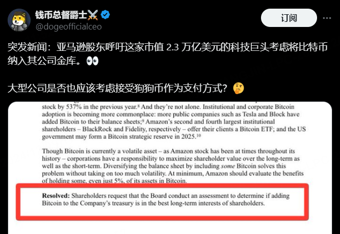 不管是否通过,这种趋势已经形成了,目前亚马逊2万亿市值,哪怕买5%的比特币,也相当于1650亿美元,这种预期也会直接推动比特币去冲20万美金