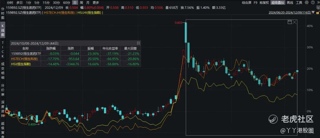 在港股近期的回调里,恒生指数回落至20000点下方,恒生科技指数也有明显回调,若从10月8日的高点以来计算,恒生指数回调14%,恒生科技指数回调17%,而在这轮行情里关注度不高的恒生医药ETF(159892)反而是10月8号以来,回调幅度最小的一个行业,也是在近两周内最先止跌反弹的行业。