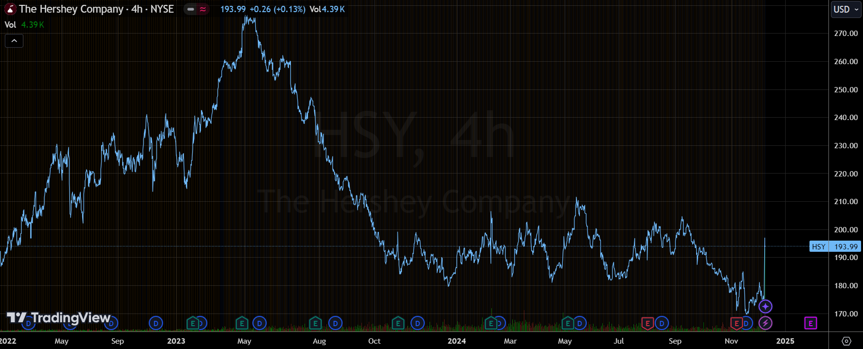 $好时(HSY)$ 在周一股价飙升11%,因为Bloomberg报道, $亿滋(MDLZ)$ 正在评估对这家巧克力制造商的潜在收购,并提出了初步意向。当然,商议处于早期阶段,目前尚不确定谈判是否会促成交易。