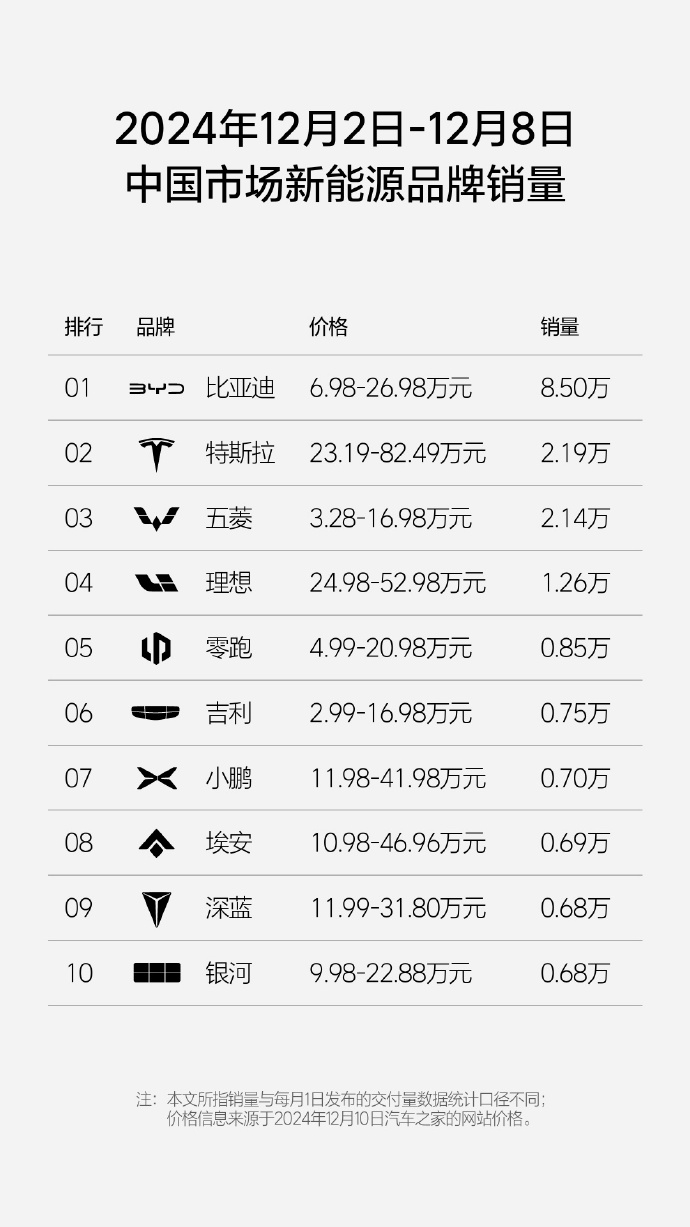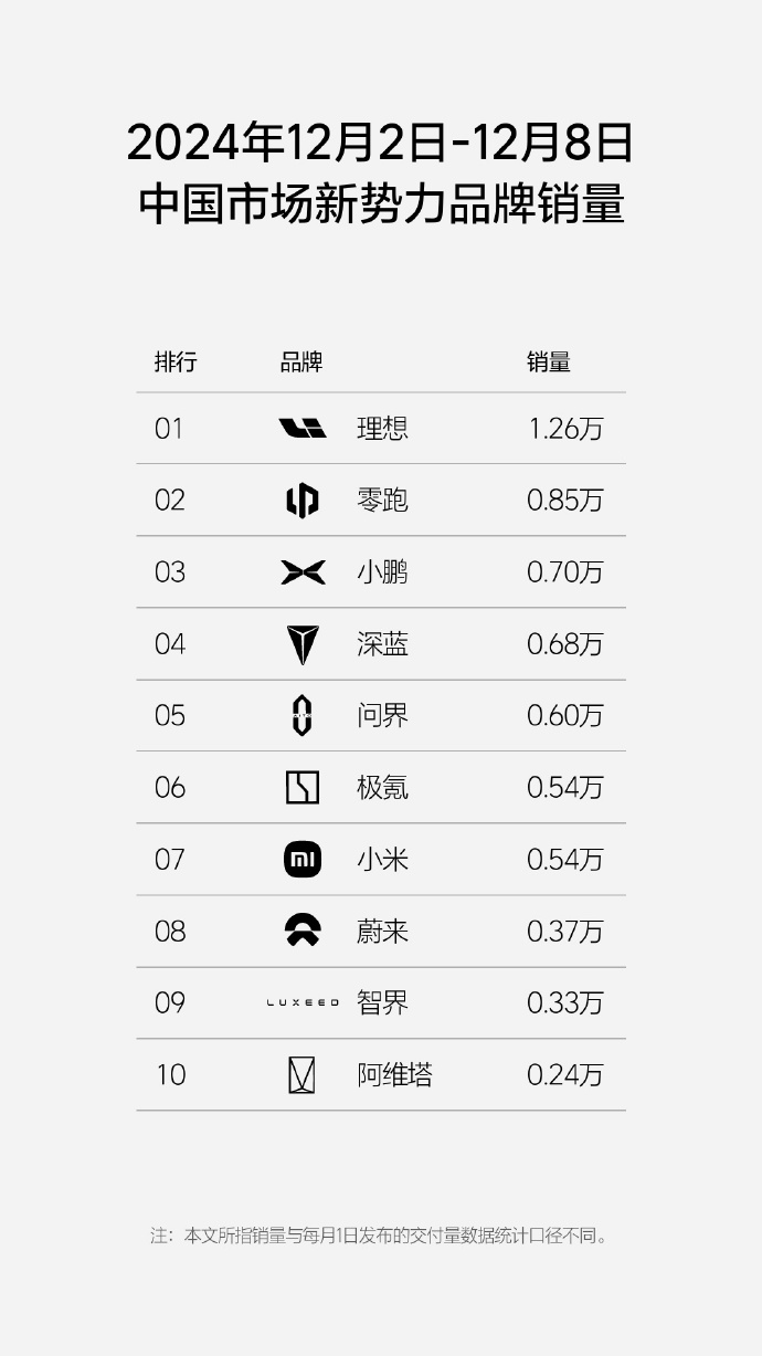 【新能源周榜】2024年第49周新势力车企销量(12.2-12.8)