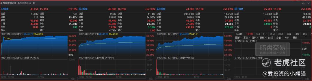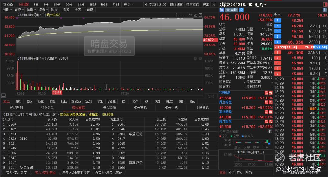 毛戈平 (01318.HK) 辉立暗盘以36.00港元高开,立马上冲到41.50港元后稍有回落,之后就震荡爬行,一直涨到最高点46.40港元,尾盘稍有回落以46.00港元报收,涨幅54.36%,振幅34.90%。BTIG和0945都来抢筹,分别成交3760万港元和3076万港元。