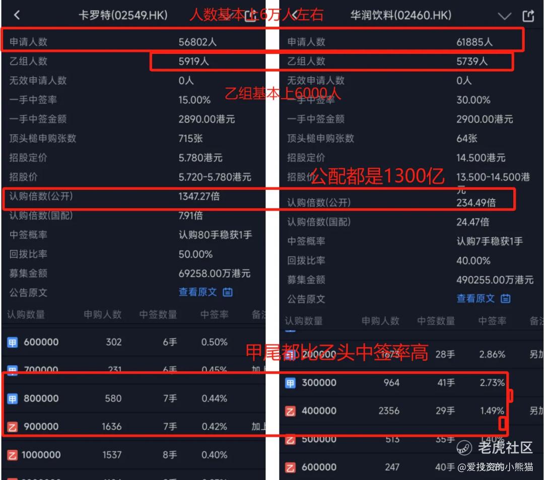 其实从对比毛戈平,卡罗特和华润配售结果就发现了,自从fini政策实施以来以前那种多券商多户打新的玩法现在没办法用了,现在是一人一户的时代,就跟我们当年想象的一样,乙组变得更卷,甲组反而开心了,这两个票人数基本世6万人左右,哪怕毛戈平来了,也才6.9万让,卡罗特和怡宝乙组基本上6000人,公配都是1300亿,甲尾都比乙头中签率高,毛戈平这次乙组也才7800人,因为发的股数多募资规模大,一手中签率100%!