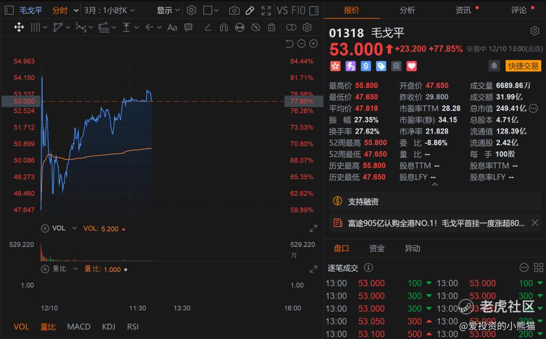 $毛戈平(01318)$ 公配919.18倍,国配30.34倍,暗盘大涨54.36%,上市首日高开59.90%,瞬间上冲到55.80港元,,一个上午就已经31亿成交额了,这都是把公配的10亿货覆盖3遍了,在绝对买盘面前,这个抛压不是问题,当时还很多人担心这票盘子大抛压大,但实际上买盘如果更多的话,这个也就不用考虑了。毛戈平这是对标巨子生物了,市盈率快差不多了。