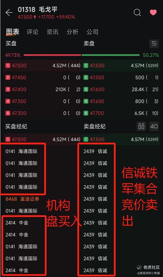 这次毛戈平信诚照样是集合竞价第1个挂单的。信诚的铁军集合竞价永远都是跑的最快的,他们有一批人是真的是纪律严明的铁军,永远都是新股首日集合竞价卖出的,不管新股是涨是跌,反正都是集合竞价挂单。其实这个策略是挺好的,反正不管什么新股开盘集合竞价就卖,机械化的操作,不带任何感情色彩。这么多年从现在角度去看,这是一群聪明的人,对于大家,如果新股把握不好的,也可以执行这个策略,有时候最苯最简单的方法往往是最有效的,他们一定是评估过的,首日竞价无脑卖,长期收益很稳定。非常值得大家学习。我们现在也都加入了信诚铁军,这次我有20个甲尾和乙组参与了这个票,耗资也才一个顶头锤的资金。