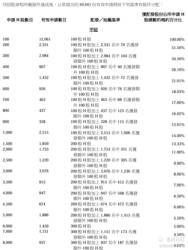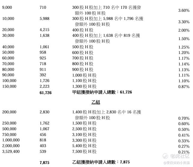 毛戈平 (01318.HK) 的乙组官方披露的中签名单里有2814人中签1400股,有1778中签1500股,有1067人中签2500股,有456中签3100股,有818人中签3300股,有403中签5400股,有539人顶头槌申购中签7500股。乙组总共中签1960.58万股,货值5.84亿港元。