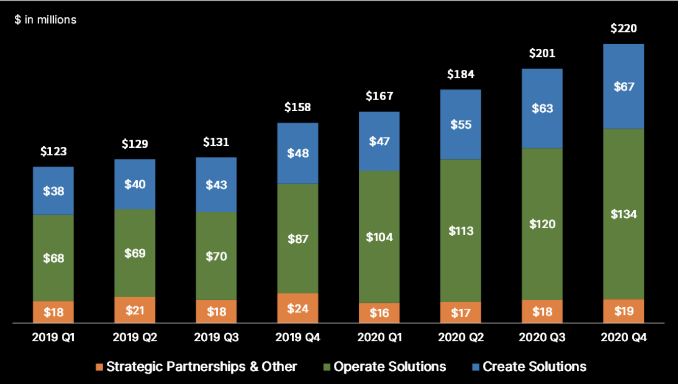 Unity主要提供两种订阅服务:Create Solutions(开发解决方案)和Operate Solutions(运营解决方案)。其中,Operate Solutions是公司最主要的收入来源。2020年4季度,运营解决方案(Operate Solutions)收入1.343亿美元,同比增长55%,Create Solutions收入6690万美元,同比增长39%;战略伙伴关系(Strategic Partnerships)和其他收入为910万美元,同比减少19%。战略伙伴关系(Strategic Partnerships)项目,就是比如Sony的设备,Microsoft和苹果等,这一部分一直占比不高,这个季度也没有增长,我就不具体奖励