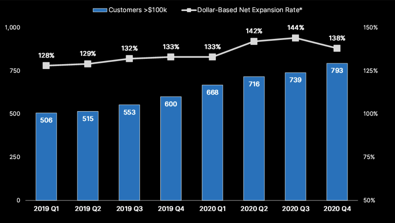 Unity第4季度总收入达到2.2亿美元,同比增长39%,超过分析师预期的2.05亿美元。非美会计准则下Unity的营业利润率为-9%好于去年同期的-15%。截至2020年12月31日,截至2019年12月31日的过去12个月里,有793个客户每个客户创造了超过10万美元的收入,而截至2019年12月31日的客户只有600个。截至2020年12月31日,以美元计算的净扩张率为138%,而截至2019年12月31日的净扩张率为133%。