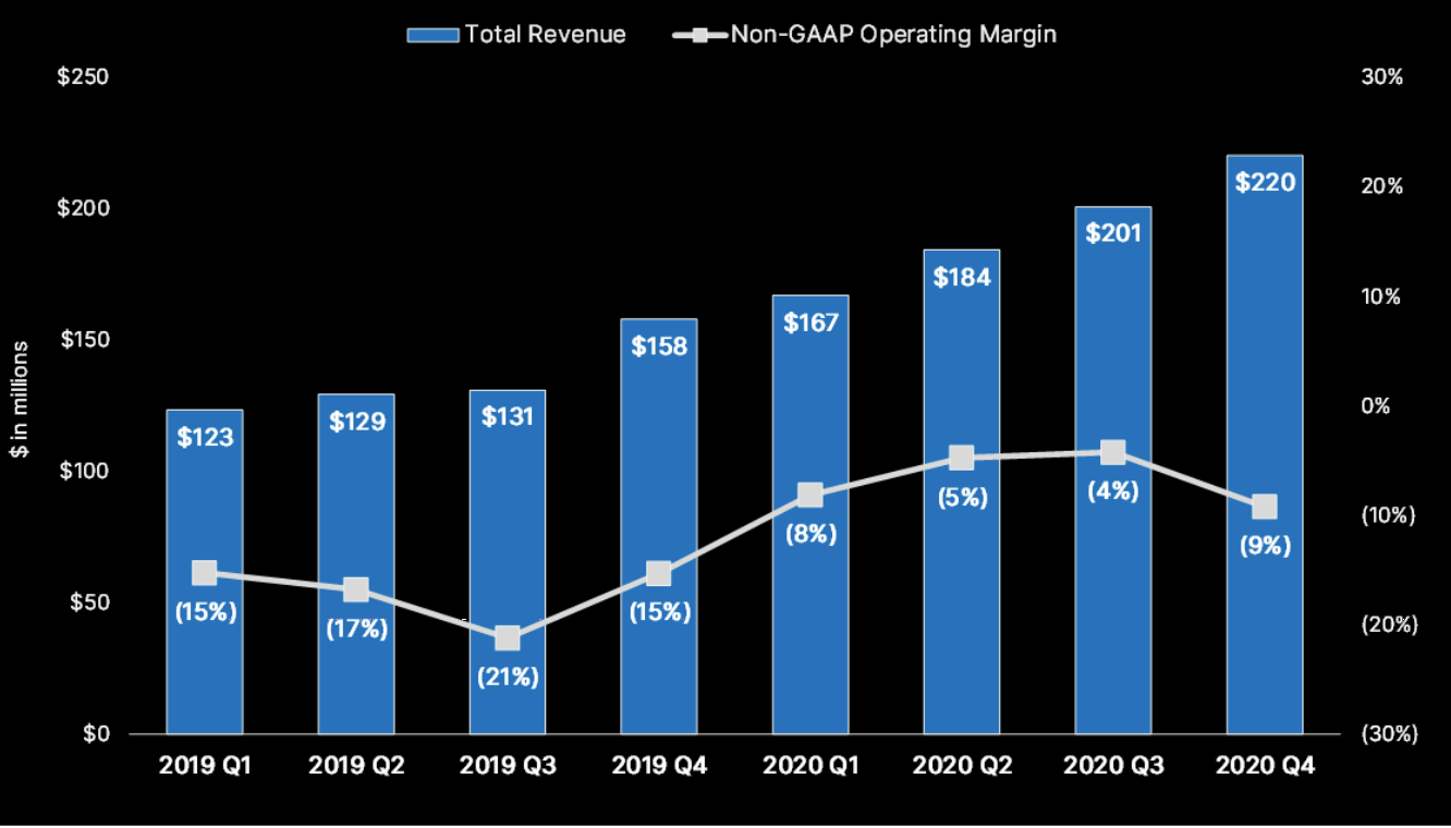 受到了基于股票的薪酬支出增加的影响。2020年4季度运营亏损为8080万美元,占收入的37%,去年同期运营亏损为4860万美元,占收入的31%。2020年4季度非gaap运营损失为2,010万美元,或营收的9%,而2019年第4季度非gaap运营损失为2390万美元,或营收的15%。