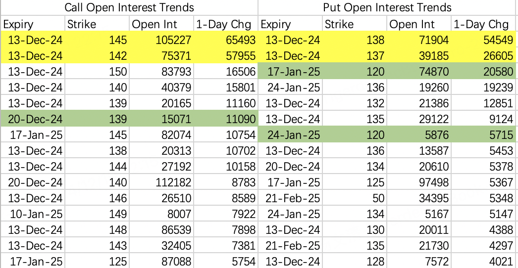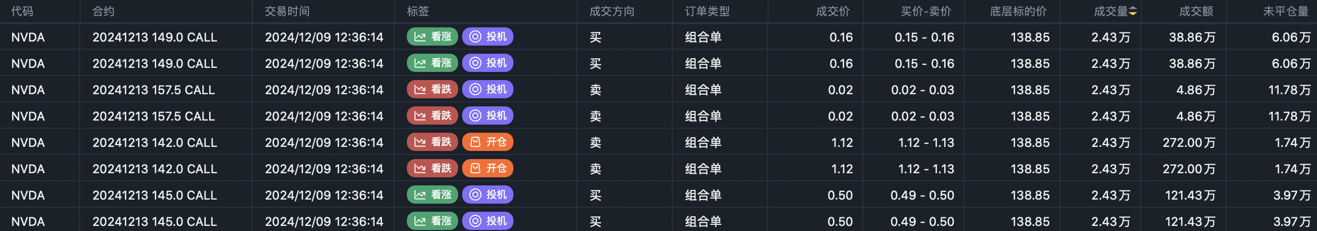 上周周中被爆仓后不得已割肉roll仓,周一出现下跌缺口,机构毫不犹豫再次卖出142call $NVDA 20241213 142.0 CALL$ ,买入145call $NVDA 20241213 145.0 CALL$ 对冲。衷心祝愿他们本周不会再被爆仓。