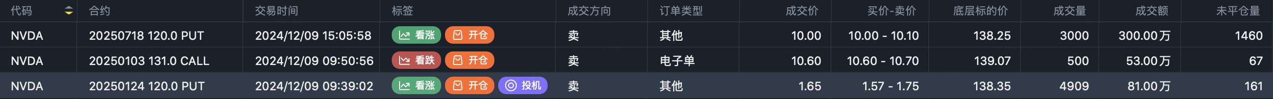 本周到期138put跟137put以卖出为主,而明年1月到期的两张120put $NVDA 20250117 120.0 PUT$ 跟 $NVDA 20250124 120.0 PUT$ ,也是以卖出为主。