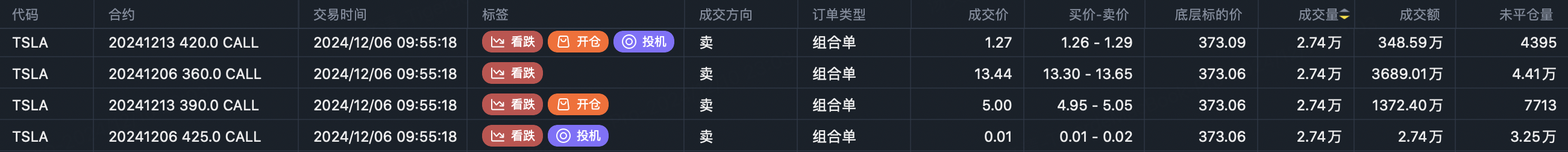周一特斯拉看涨期权开仓第一名是12月20日到期400call $TSLA 20241220 400.0 CALL$ ,开仓3.1万手,大部分成交方向为卖出。