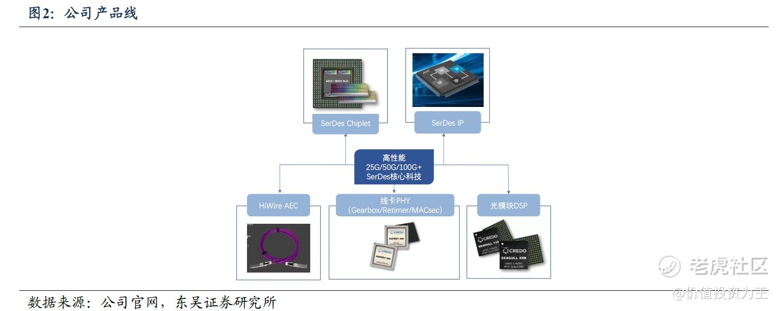 基于此技术,Credo推出了HiWire AEC(Active ElectricalCable 有源电缆),线卡PHY 和光学PAM4 DSP,同时,Credo的核心SerDes 和DSP 技术可作为授权 IP 加入到客户的 ASIC 设计,并作为芯片提供给客户集成到多芯片模块片上系统 (MCMSoC)中。