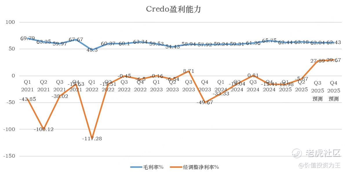 从盈利能力上看,Credo名副其实,其毛利率高达62%左右,净利率在营收规模爆发之后,有望迎来快速提升,有望在2025财年下半年,达到29%左右的水平: