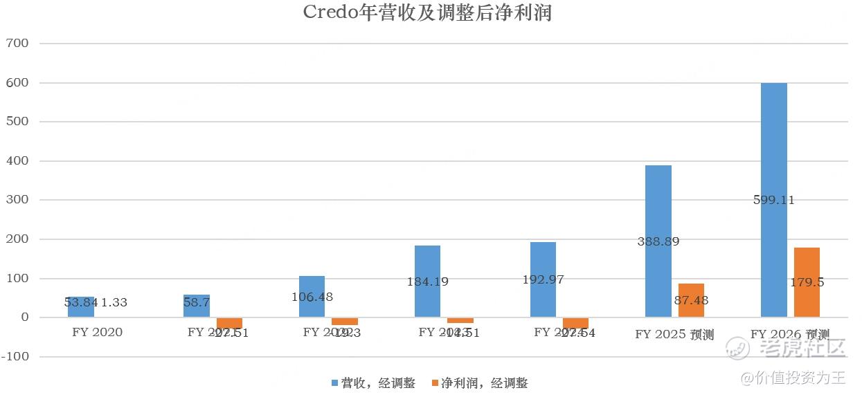 而Credo即使按2026财年调整后1.8亿的净利润计算,市盈率也高达62倍,乐观点,假设2026财年业绩超预期,净利润可以拿到2个亿,PE也有55倍: