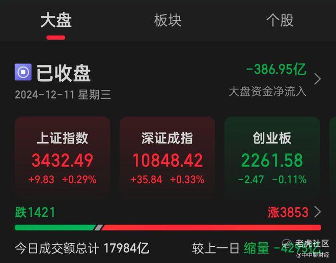 2024年12月11日,A股三大指数在收盘时表现分化,其中沪指上涨0.29%,深成指微升0.33%,而创业板指则小幅下跌0.11%,北证50指数跌幅达到1.41%。今日全市场成交额为17984亿元,较上一交易日减少4295亿元,显示出投资者观望情绪浓厚。