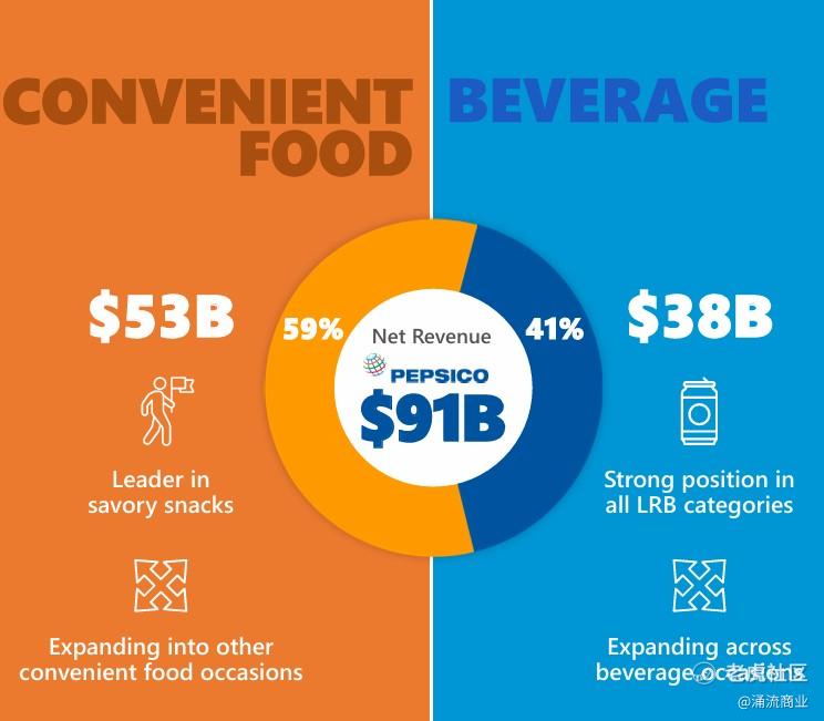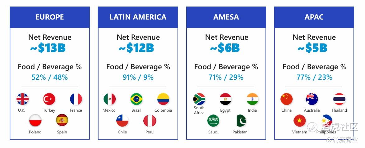 百事的饮料产品是标志性的,但其实零食食品业务占销售额的约60%,其次才是饮料;大约 60%的销售额来自北美地区,其余来自国际市场,份额较大的是欧洲和拉美。