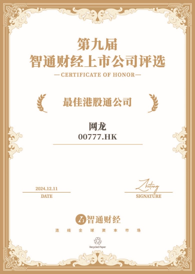 2024年 12月11日, 网龙(0777.HK)在国内领先的港美股资讯平台智通财经、中资海外私募基金一站式服务平台新智基金网联合主办的“第九届智通财经资本市场年会暨上市公司颁奖典礼”上荣获“最佳港股通公司”大奖。“最佳港股通公司”旨在表彰公司治理结构健康、行业地位显著、主营业务良好,并能够为投资者提供持续、稳定价值回报的港股通上市公司。此次获奖彰显了资本市场对网龙的高度关注与认可。
