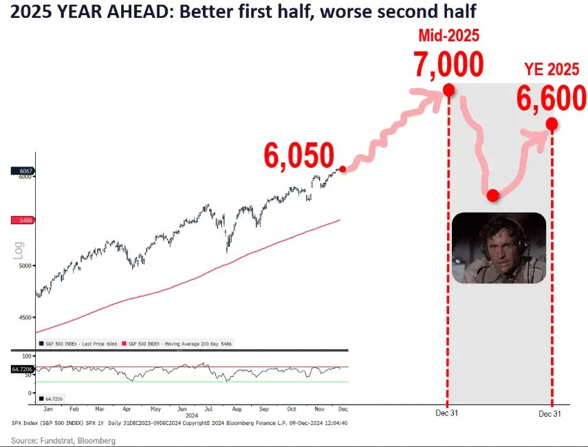 2025年展望: $标普500(.SPX)$ 2025年中期会达到7000点,而后调整到年底6600点(就算是跌到6600,也比现在高出10%),Tom Lee称之所以会发生这种情况,是因为历史表明,连续涨20%的概率是很小的,而且特朗普的关税还是个未知数。对于2025年,他看好小盘股 $罗素2000指数ETF(IWM)$ 、金融股 $金融ETF(XLF)$ 和比特币 $比特币(BTC.USD.CC)$ ,给出目标价25万美元。(相关预测图贴在评论区)