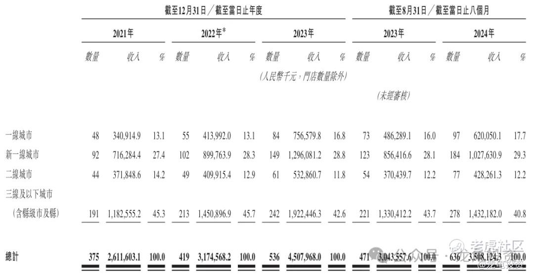 按门店分布计,一线城市2023年门店数量84家,营收7.56亿人民币,占比16.8%;新一线城市2023年门店数量149家,营收12.96亿人民币,占比28.8%;二线城市2023年门店数量61家,营收5.32亿人民币,占比11.8%;三线及以下城市2023年门店数量242家,营收19.22亿人民币,占比42.6%;