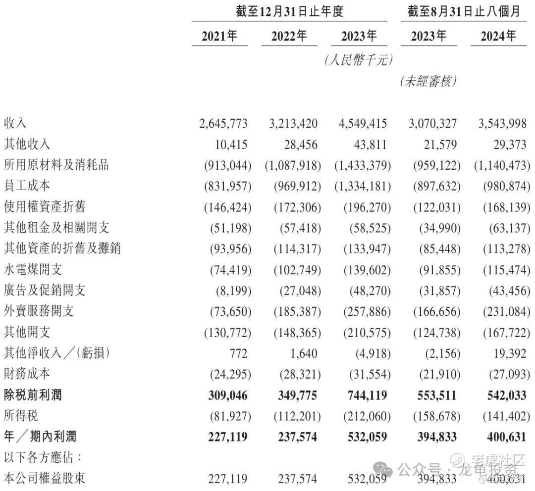 毛利:2021年毛利3.09亿人民币,2022年毛利3.50亿人民币,2023年毛利7.44亿人民币,截止2024年8月31日最近12个月毛利7.32亿人民币。