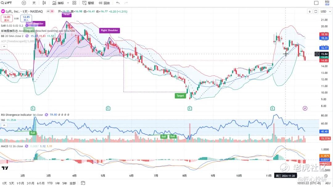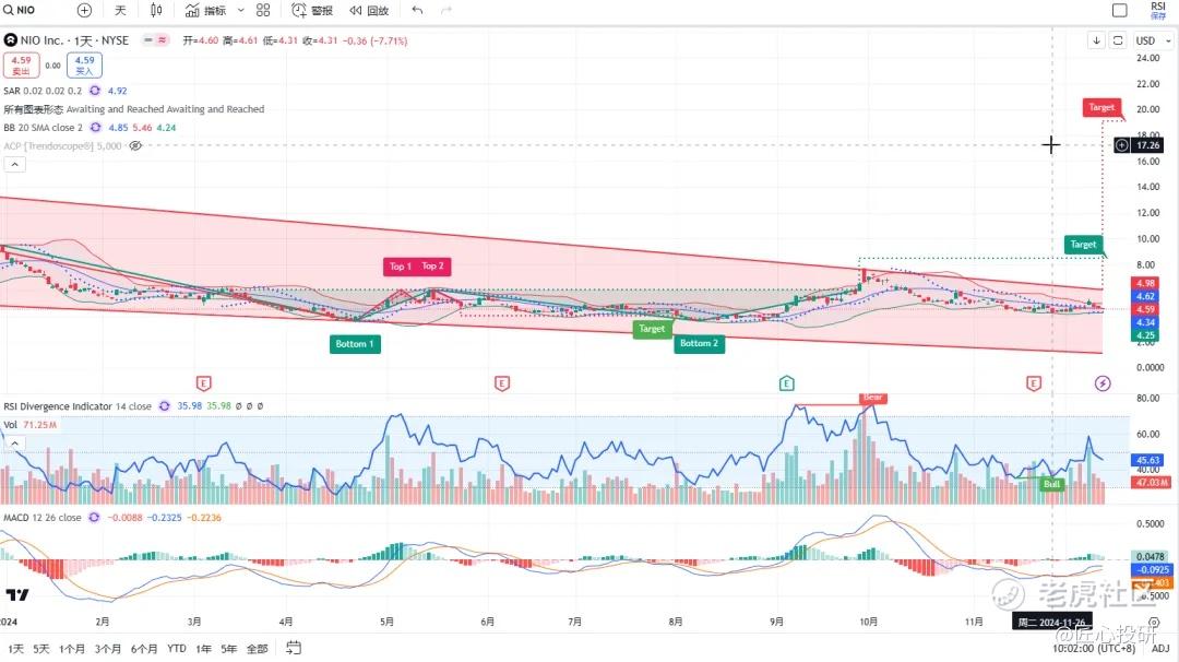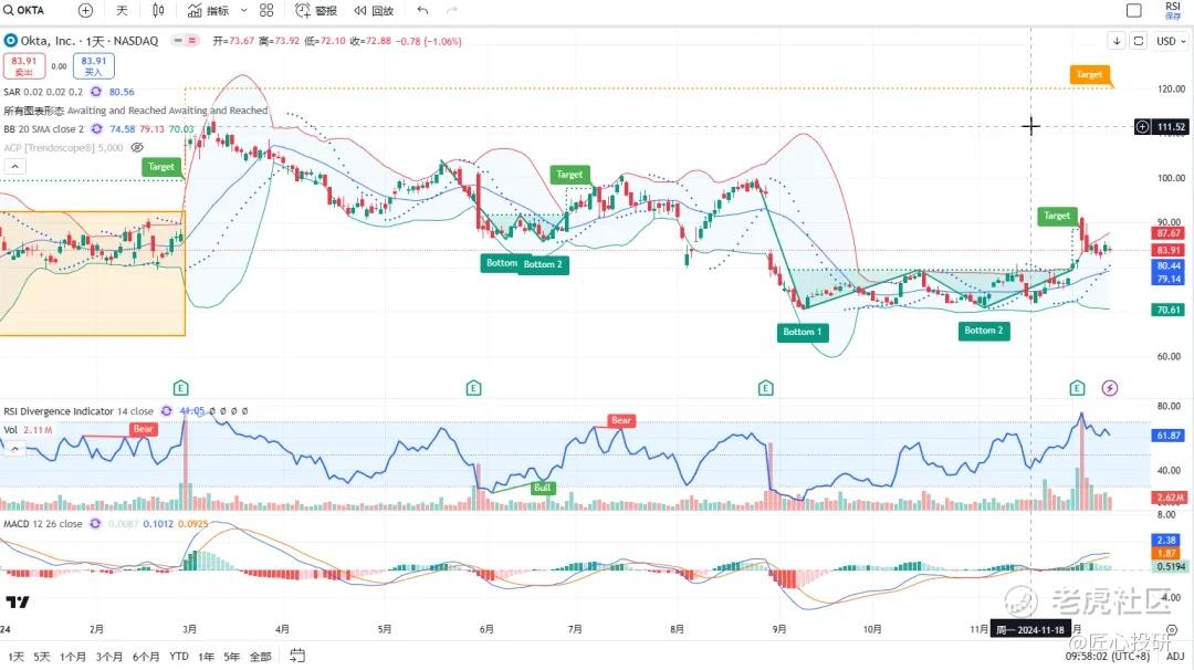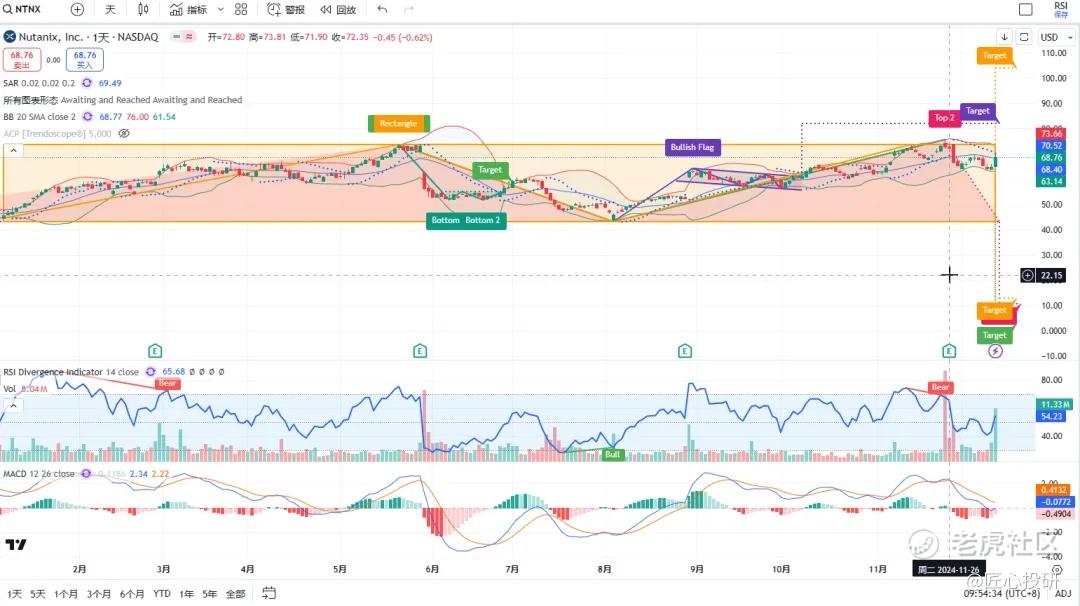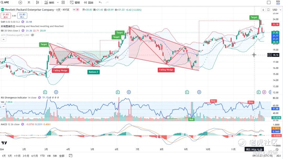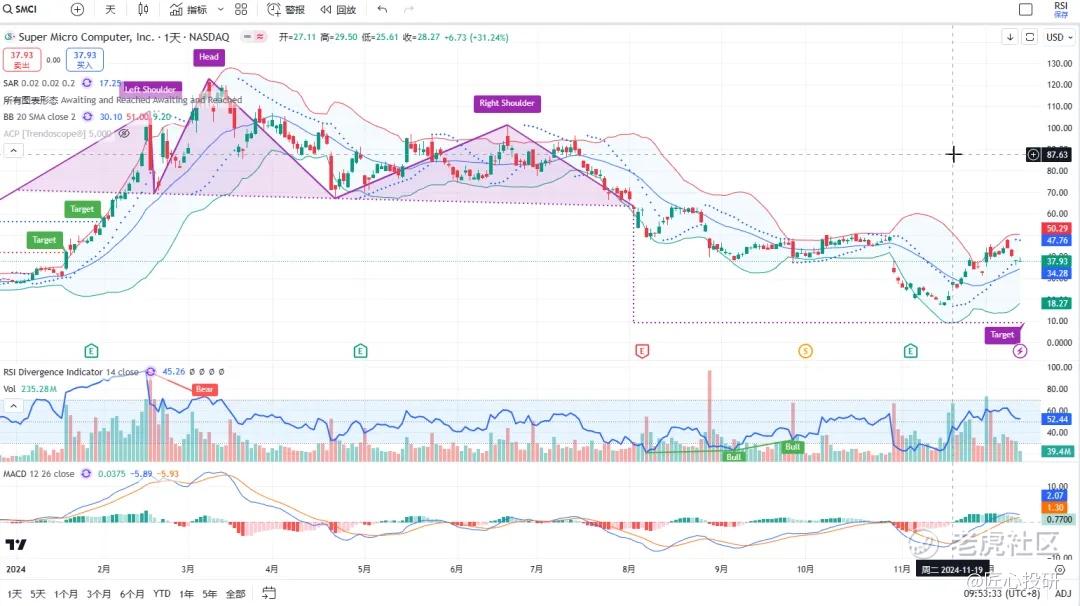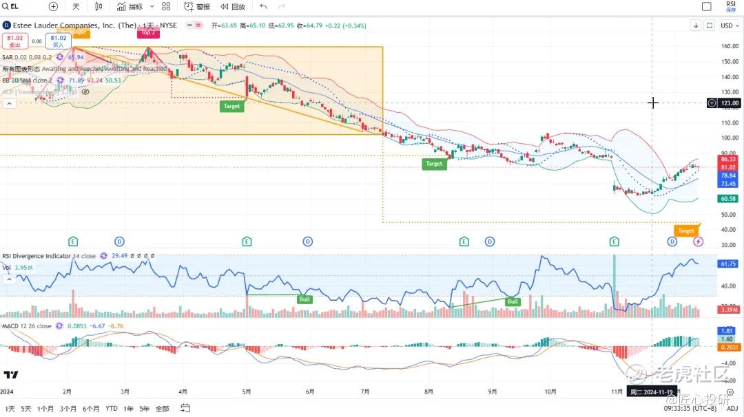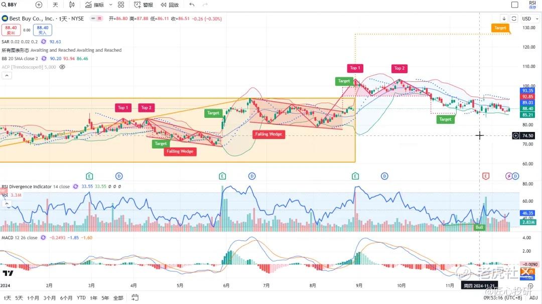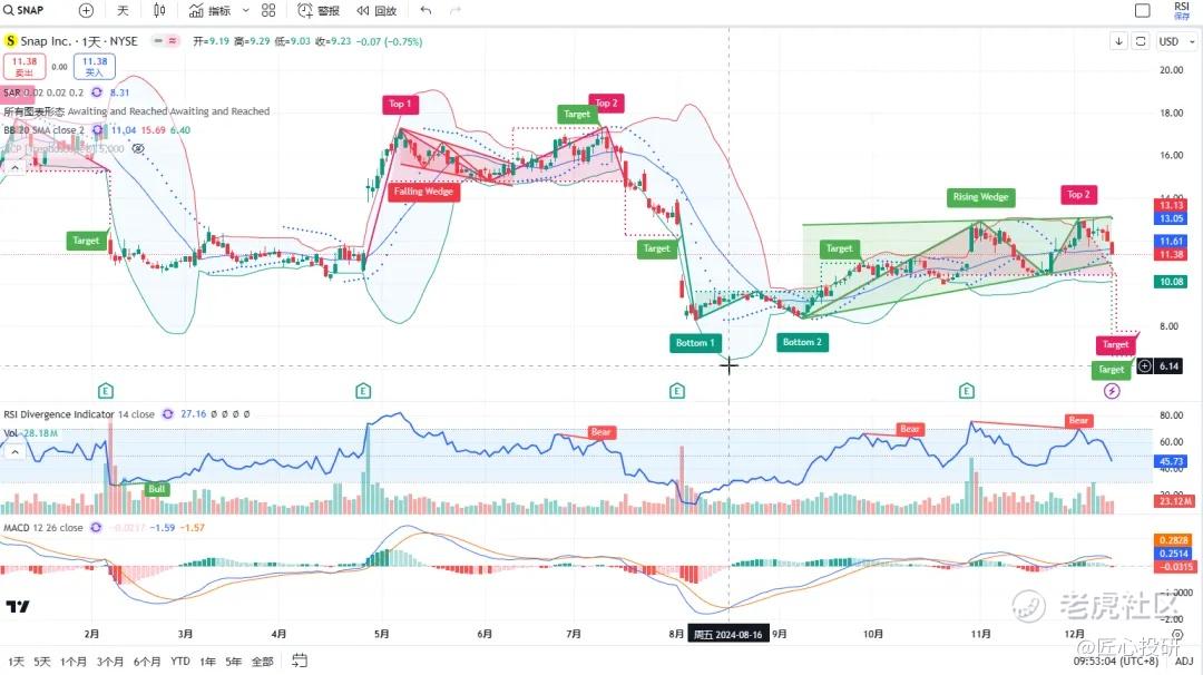 关于目标价:图中标注的“Target”是对应形态的理论目标价位。请注意,目标价并不保证100%达成,有时也可能失效。(内容比较多,图中没有Target的代表无形态,如果没有特殊说明,那就是无形态无目标价)