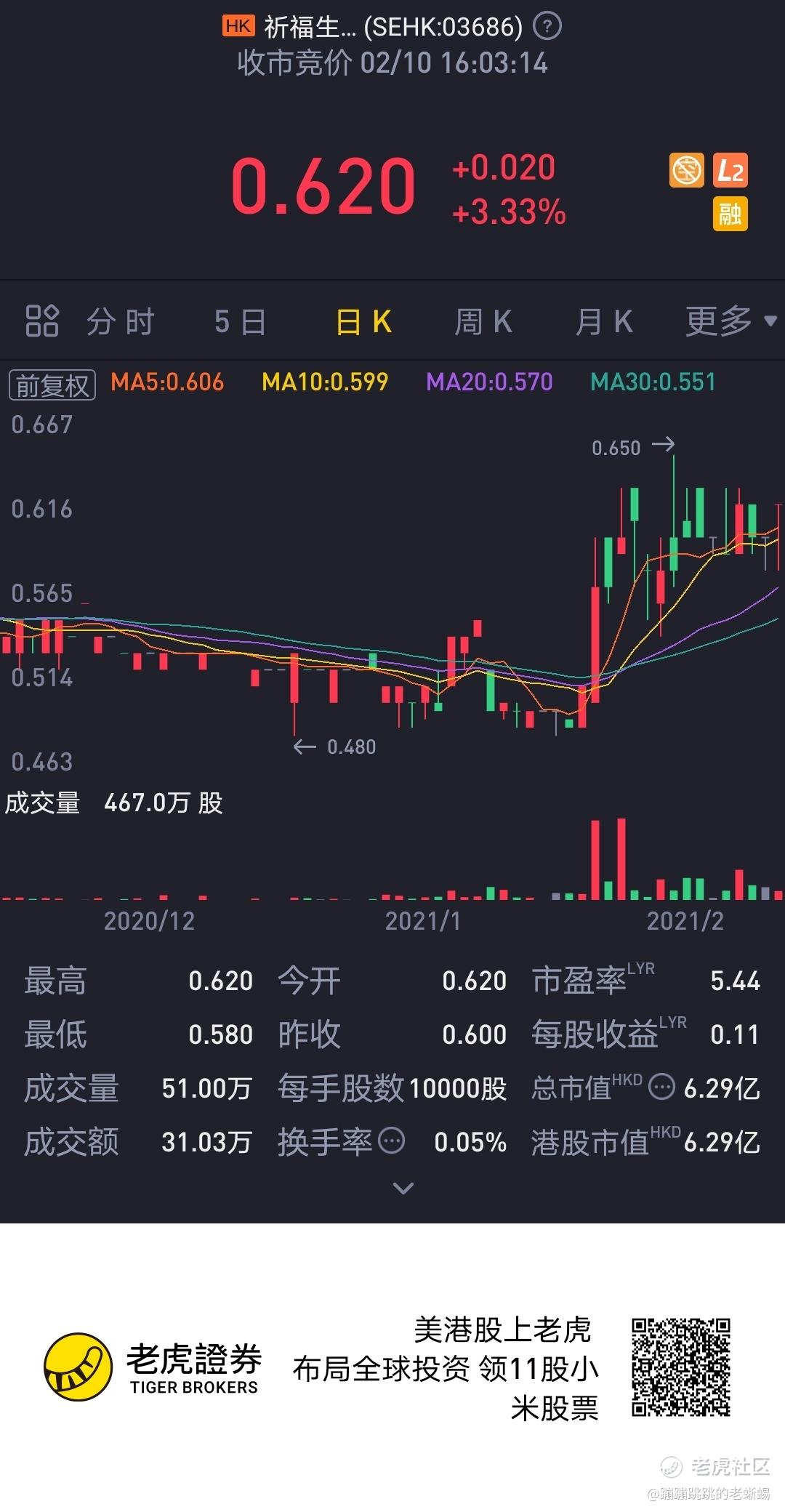 节前最后一天,0.62元 买入10000$祈福生活服务(03686)$