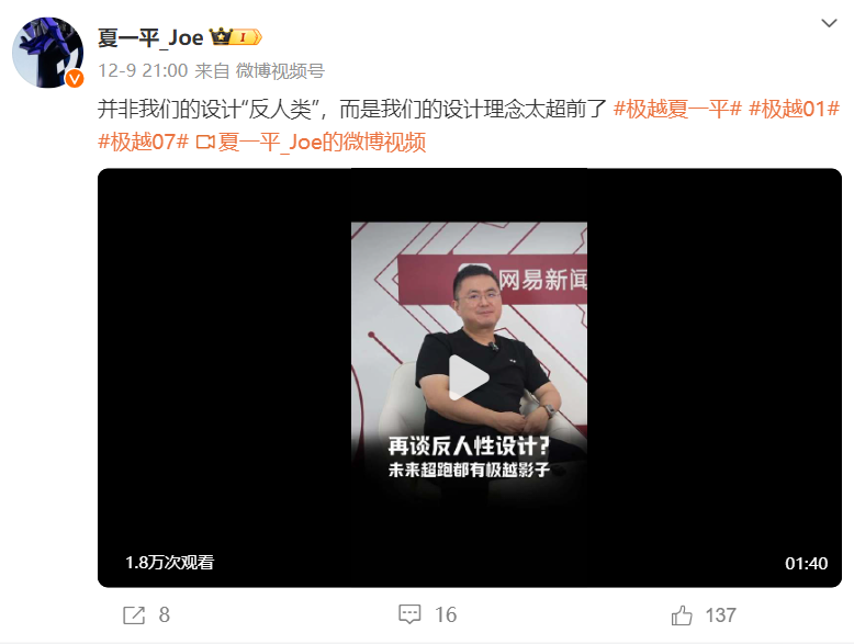 看来雷军说的对,到不了世界前五,就生存不下去。因现金流问题,极越突然宣布“就地解散”,场面搞得很难看,CEO夏一平被员工围堵,最新一条微博停留在了12年:“极越设计理念太超前”。[心碎]