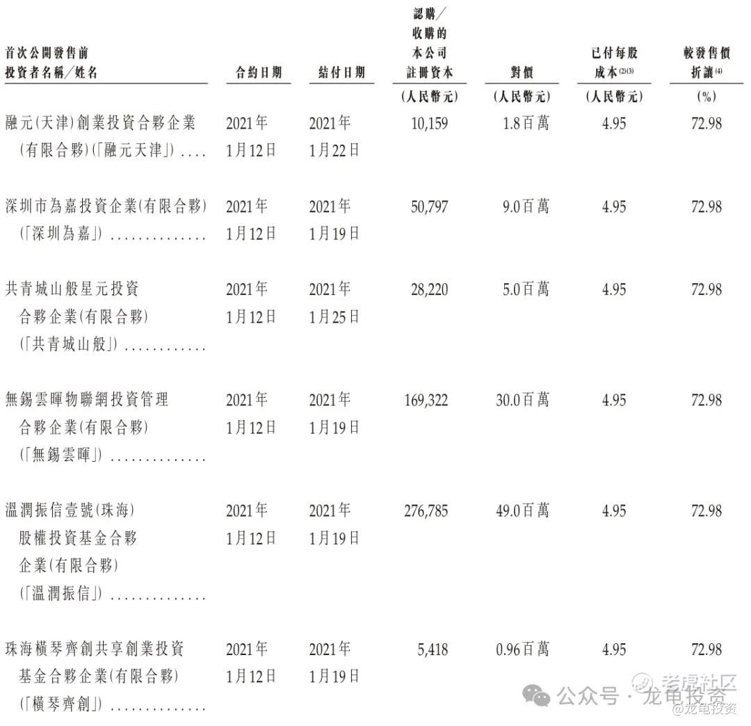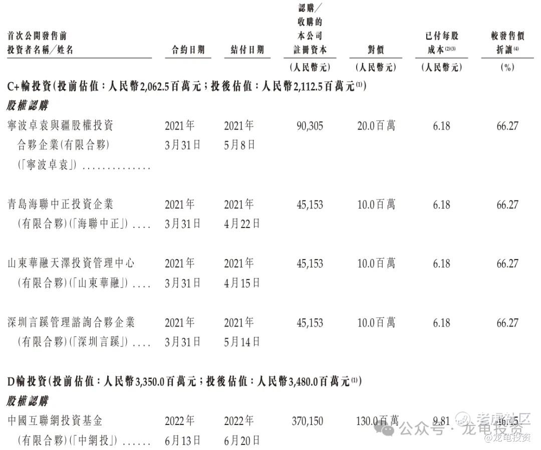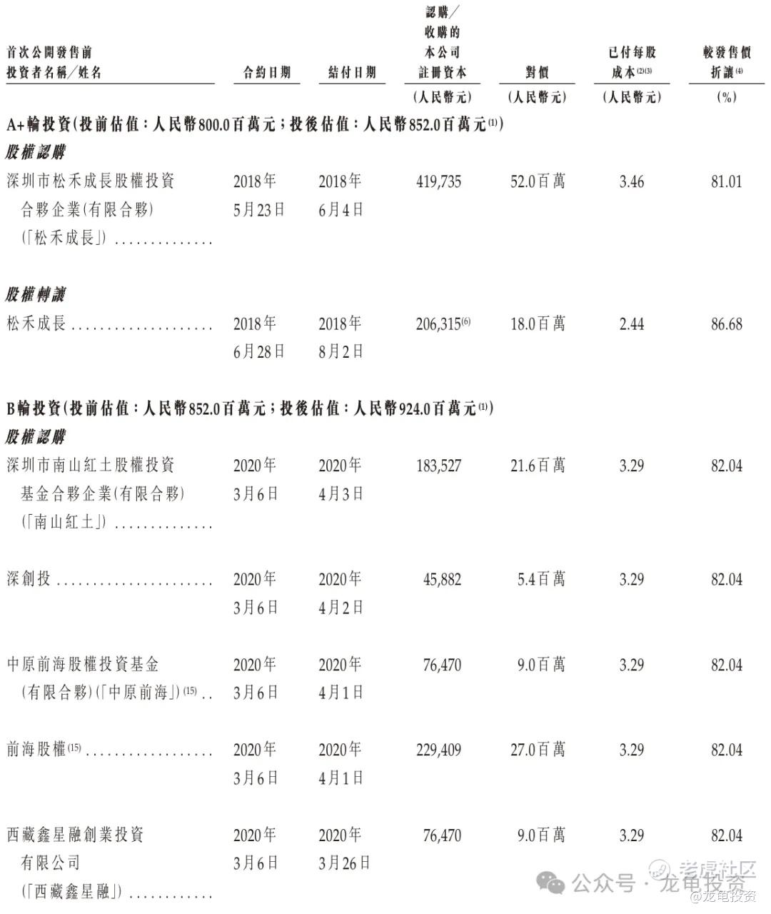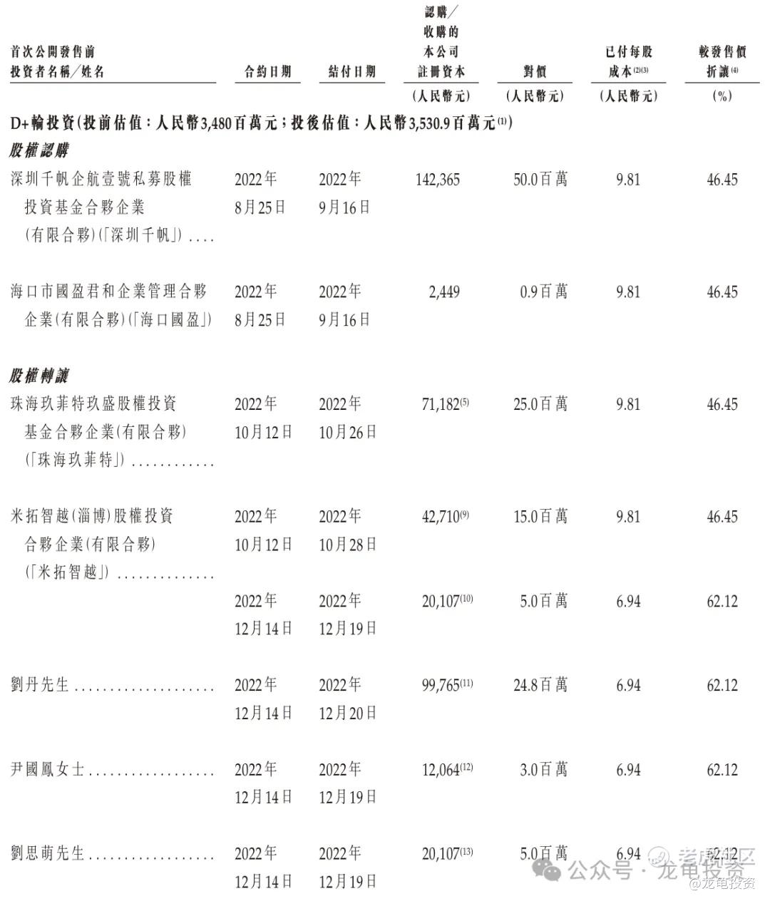 公司IPO前完成多轮融资,最后D+轮融资完成于2022年9月,投资前估值34.80亿人民币,投资后估值35.30亿人民币,每股成本9.81元人民币,较发售价折让46.45%,禁售期12个月。