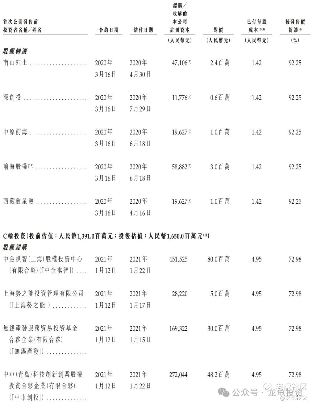 公司IPO前完成多轮融资,最后D+轮融资完成于2022年9月,投资前估值34.80亿人民币,投资后估值35.30亿人民币,每股成本9.81元人民币,较发售价折让46.45%,禁售期12个月。