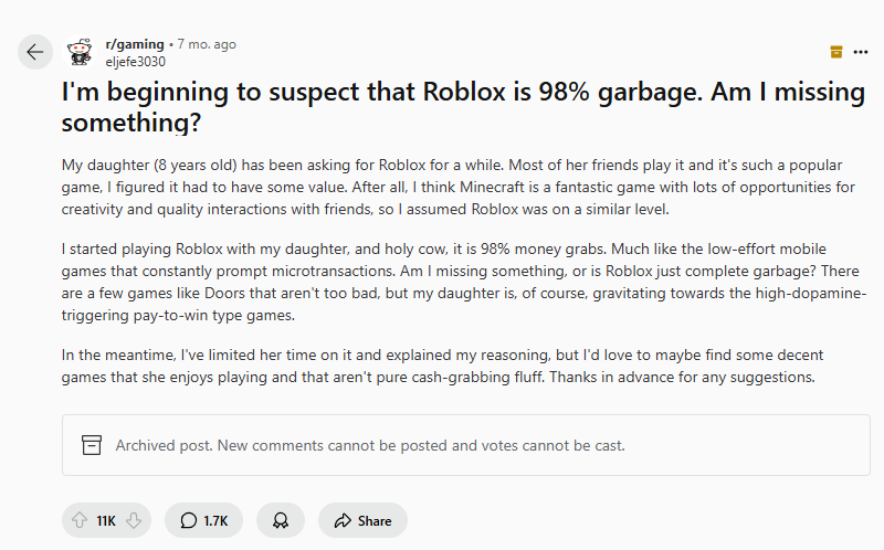 从这个层面看,Roblox无疑是成功的,但问题在于,Roblox始终是一个儿童平台。目前日常用户中仍约有 62% 不超过 17 岁,42%的用户年龄在13岁以下。