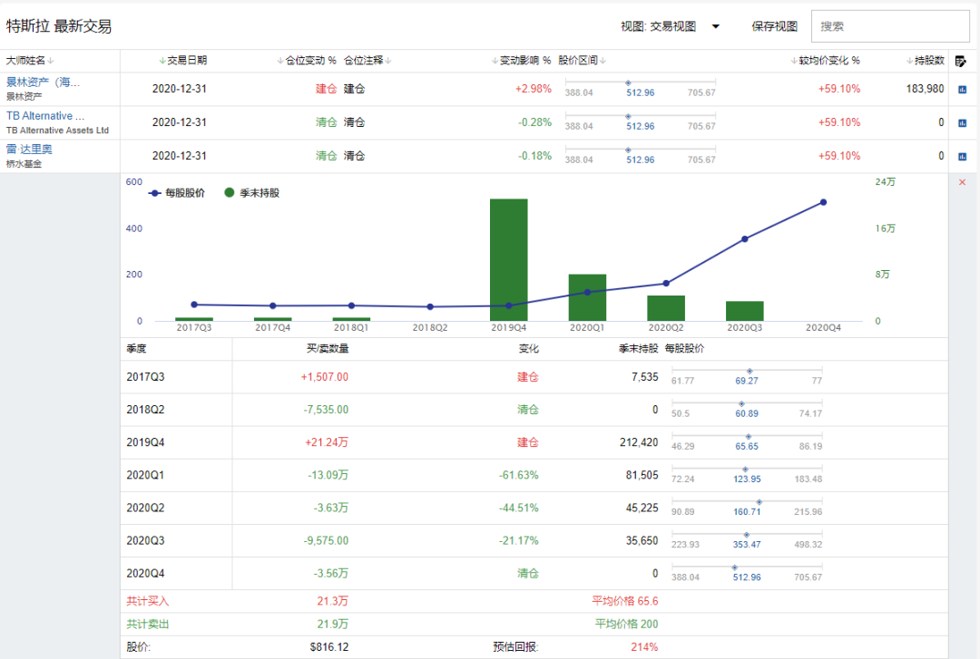 价值大师中文站“大师交易”显示,除去桥水基金,挚信资本也清仓了特斯拉。