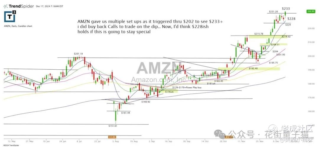 亚马逊在突破 202 美元后上涨至 233 美元以上,我在回调时买回了看涨期权。现在,228 美元区域的支撑需保持稳定,以确保涨势继续。