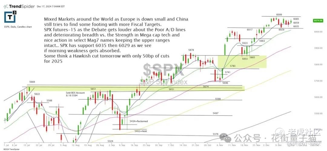 全球市场表现不一,欧洲市场小幅下跌,中国仍在寻求更多财政目标以稳定局势。SPX 期货下跌 15 点,市场辩论声逐渐增大,关注 A/D 线表现不佳和市场宽度恶化,与此同时,科技巨头表现强劲,保持了高位区间。SPX 的支撑位在 6035 和 6029,需关注早盘疲软是否被吸收。一些人预计明天将有鹰派降息,幅度可能仅为 50 个基点,预期目标指向 2025 年。