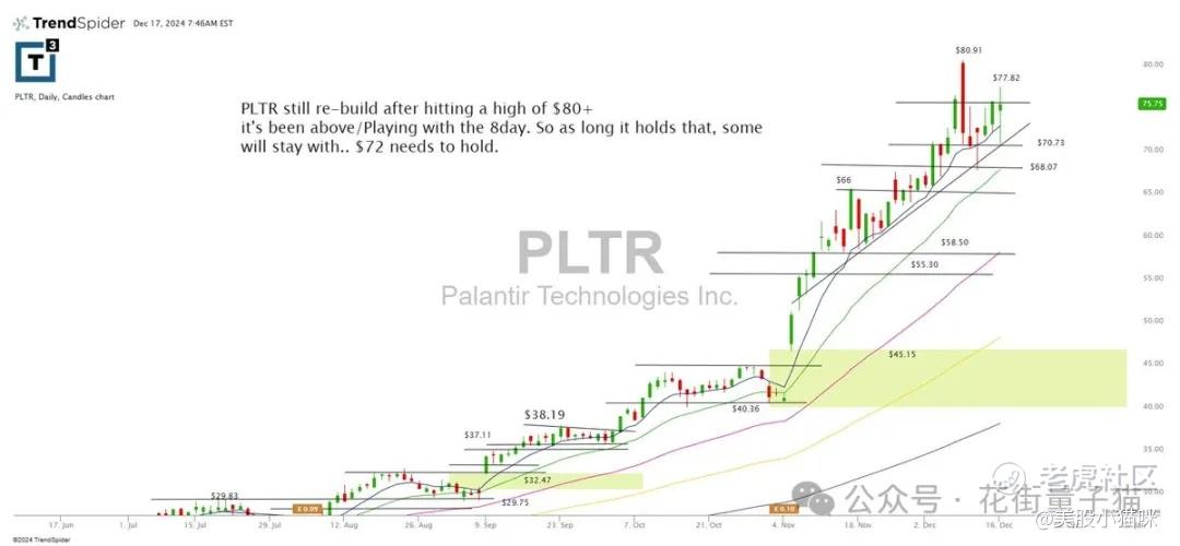 PLTR 在触及 $80+ 高点后,继续保持重建涨势,当前处于 8 日均线之上。如果股价能够继续守住 $72,部分投资者将继续持有。