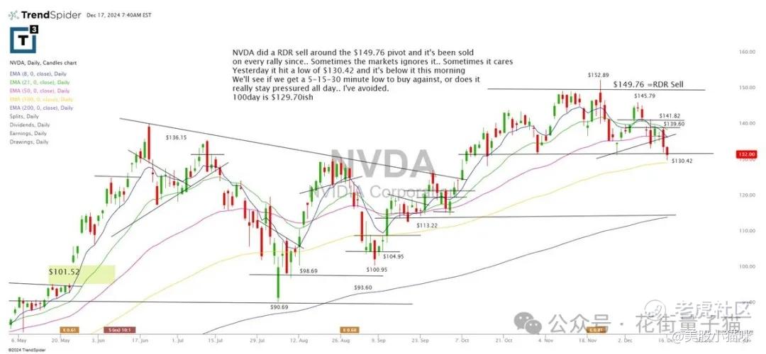 NVDA 在 $149.76 附近形成 RDR 卖出点,此后每次反弹都被抛售。昨天股价最低触及 $130.42,今天早盘跌破这一位置。接下来需要观察市场是否会在 5-15-30 分钟低点形成反弹,还是全天保持压力。目前 100 日均线支撑在 $129 附近。